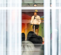 im D’haus — Festivalrede von Amir Reza Koohestani, Ansprachen von Schirmherr OB Dr. Stephan Keller und Dr. Reitemeyer vom Ministerium für Kultur und Wissenschaft des Landes Nordrhein-Westfalen — musikalische Begleitung Desmadre Orkesta